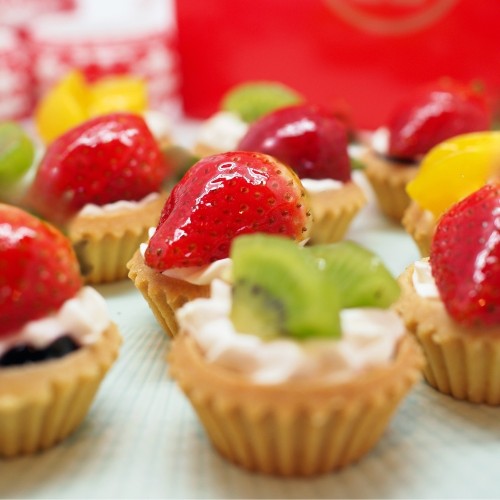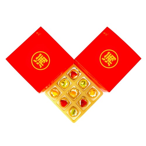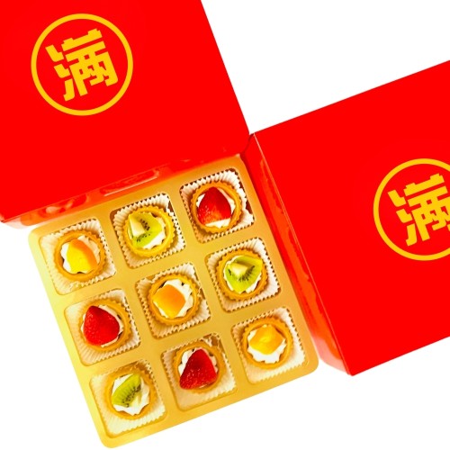 A mix of 9 Mini Fruit Tartlets filled with freshcream and blueberry jam, topped with assorted fresh fruits. Packed in a red color Traditional Gift Box (est. 8" x 8" x 3"). Minimum 10 Sets. NOTE: all cakes and tartlets needs to be refrigerated. Alternatively, you can keep in air-conditioned environment for up to 3-4hours. For urgent order of less than 7days notice, or if you require less than the stated minimum quantity, please contact us at 64576159 or enquiries@pgcake.com for assistance.