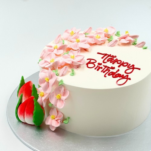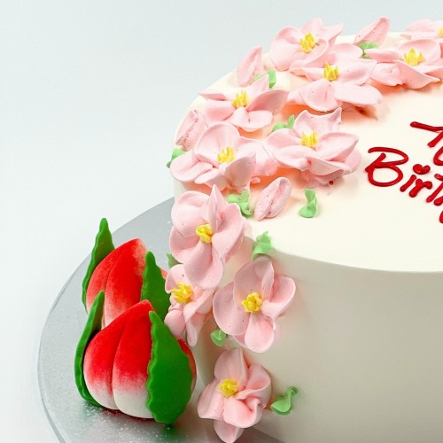 A sweet-looking longevity cake for mums and grandmas! Handpiped with petite pastel pink flowers cascading down on one-side of the cake, end off with auspicious icing Shou Taos. Choose from a wide range of cake flavours (top-up to exquisite flavours such as Passion Pink Guava, Rambutan Osmanthus Yogurt, Strawberry Milk-Shake Panna Cotta, Grapefruit Oolong, Yakult Soju, etc available, contact our team for assistance). For further customisation request, please contact 6457 6159. Delivery service available at $18 per trip, waived for orders above $280. For urgent order of less than required notice period, please contact us at 64576159 or enquiries@pgcake.com for assistance.