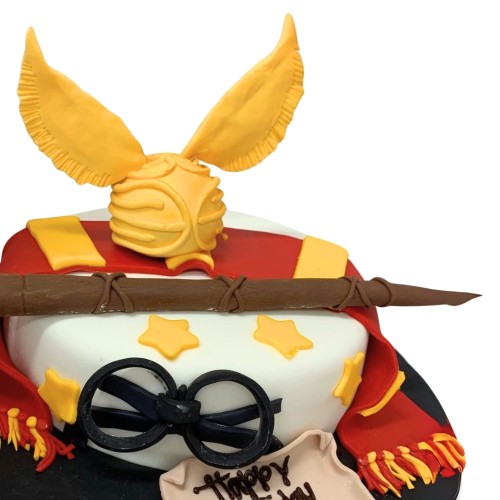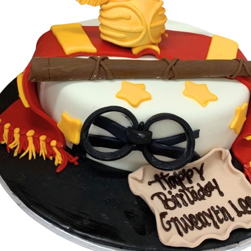 This Harry Potter design cake features a full fondant covered cake with fondant Gryffindor scarf, wand, Golden Snitch, and round glasses. For further customisation request, please contact 6457 6159. Delivery service available at $18 per trip, waived for orders above $280. For urgent order of less than required notice period, please contact us at 64576159 or enquiries@pgcake.com for assistance.