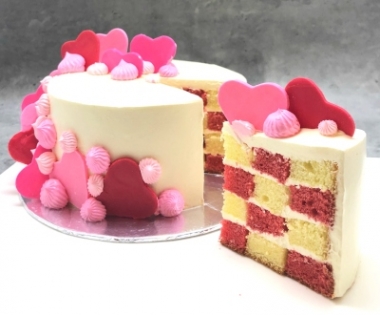 Impress with a Buttercream Checkerboard Cake this Valentine's Day. This unassuming cake has a magical secret! Layers of luscious buttercream over alternate cubes of vanilla & strawberry cake, embellished with lots of chocolate hearts. Limited time only, comes in 0.5kg 6" diameter size. Collection by 28 February 2019.